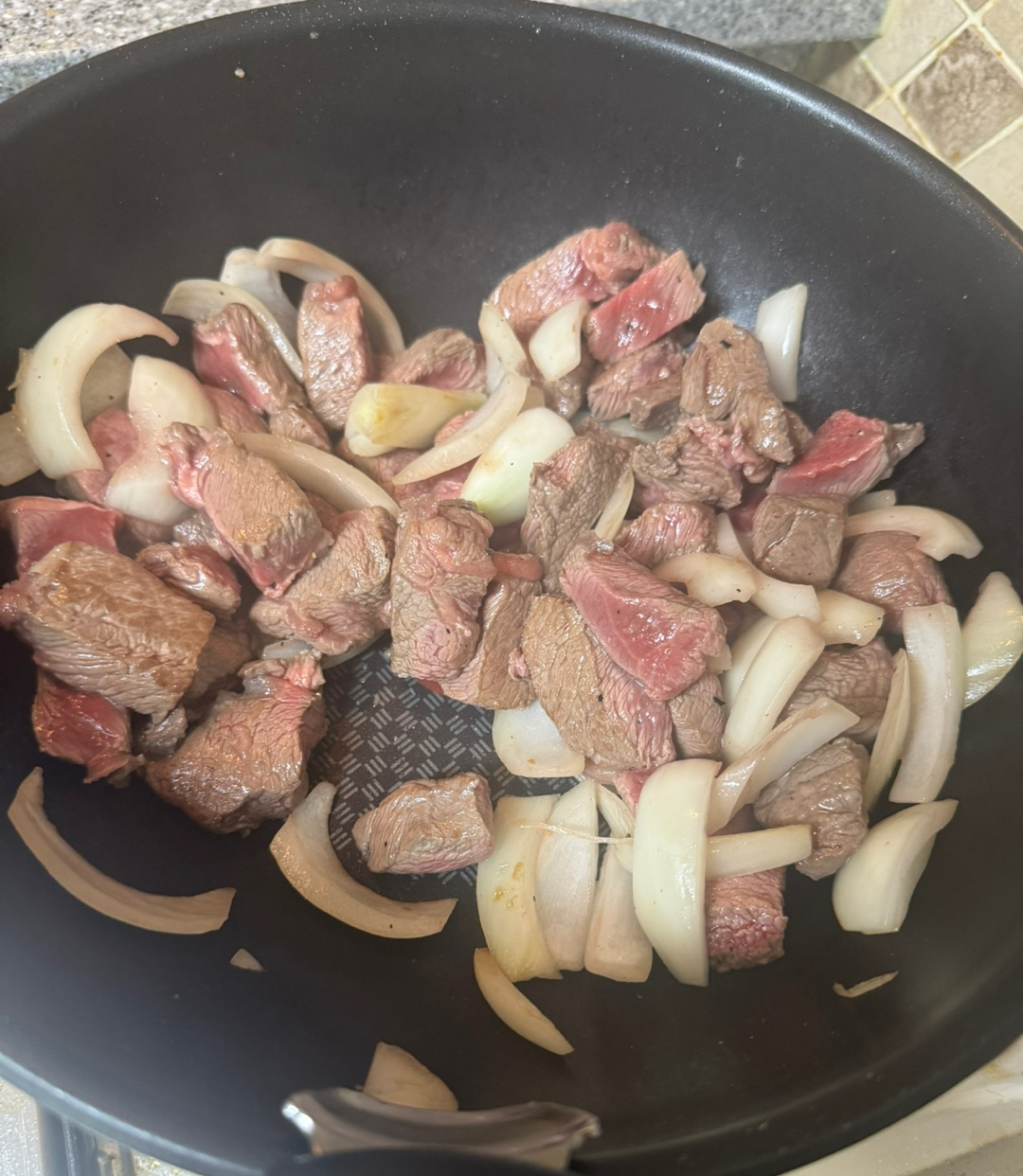 먼저 양파를 좀 볶아주고 양파가 어느 정도 익었다 싶으면 고기를 넣어줍니다.